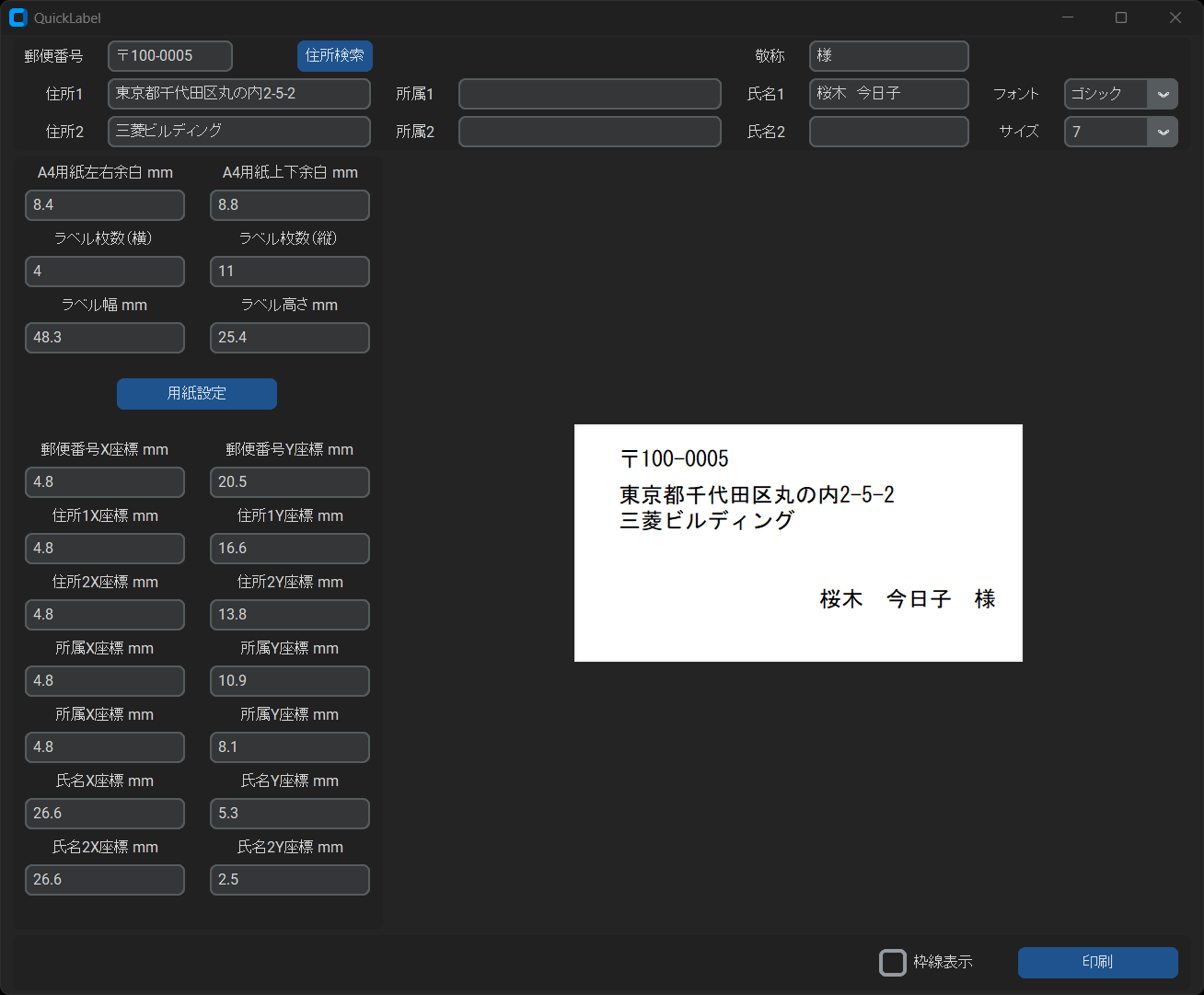 画面上部に、「郵便番号」、「住所1」、「住所2」、「所属1」、「所属2」、「氏名1」、「氏名2」、 「敬称(様、宛など)」を入力することができます。住所や部署名が長い場合や宛名が複数の場合は、 「住所2」、「所属2」、「氏名2」に入力し、2段書きにすることができます。 文字の配置・レイアウトは、画面上でマウスで自由に変更することができます。 フォントは「ゴシック(MSゴシック)」か「明朝(MS明朝)」を選択することができます。