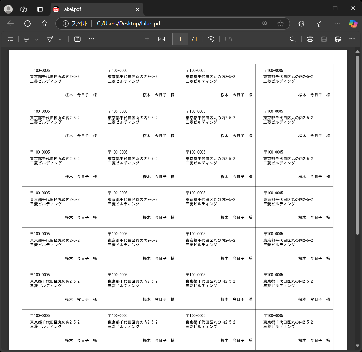 「印刷ボタン」をクリックすると、作成したラベルの印刷原稿がPDFで出力されます。 PDFはソフトウェアのexeファイルと同じフォルダに保存されます。